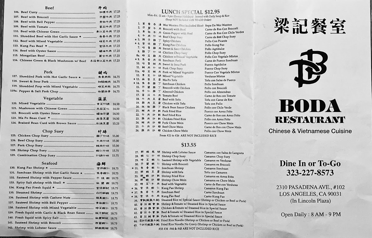 Boda Restaurant stands as a culinary gem in Los Angeles, located at 2310 Pasadena Ave. Renowned for its vibrant fusion of Vietnamese and Chinese cuisines, the menu is a delightful journey through authentic flavors. Diners rave about their hearty bowls of pho, including the rare beef and beef ball pho, celebrated for both its size and rich, comforting taste.